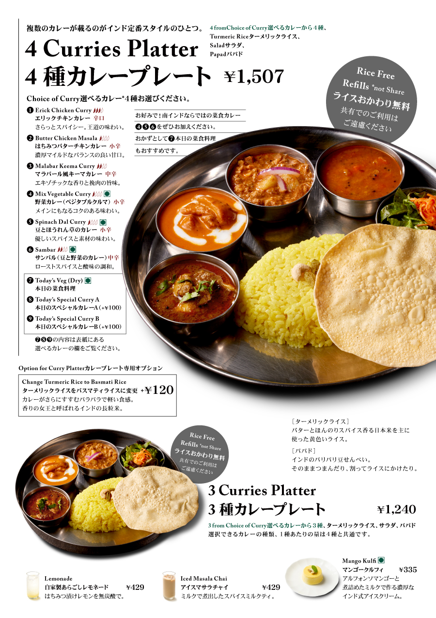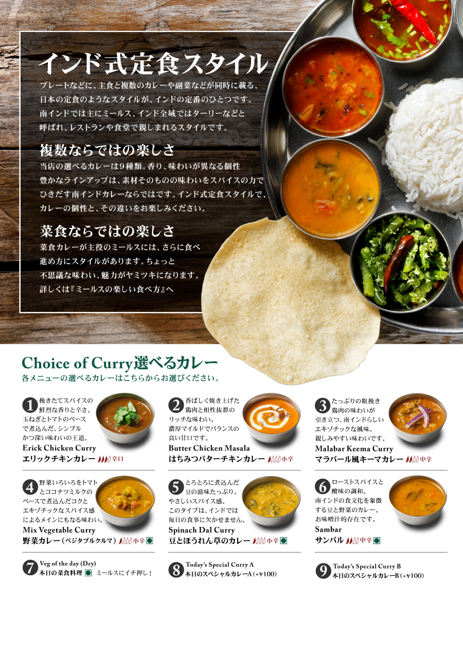 南インドらしいサラっとスパイシーな看板メニュー、エリックチキンカレーをはじめ、お肉を使わない菜食カレーサンバルなど、南インドらしいカレーを中心に9種類のカレーをラインナップ。カレープレートなどのメニューでお楽しみいただけます。