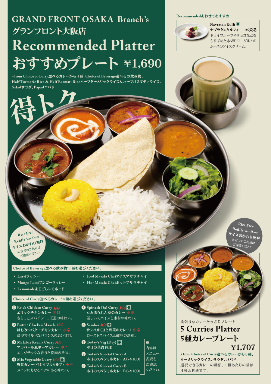 梅田駅 / JR大阪駅 / ランチ / ディナー / テイクアウト / カレー / インド料理 / インドカレー / 南インド料理 / 南インドカレー / グランフロント大阪 / ミールス / ビリヤニ /