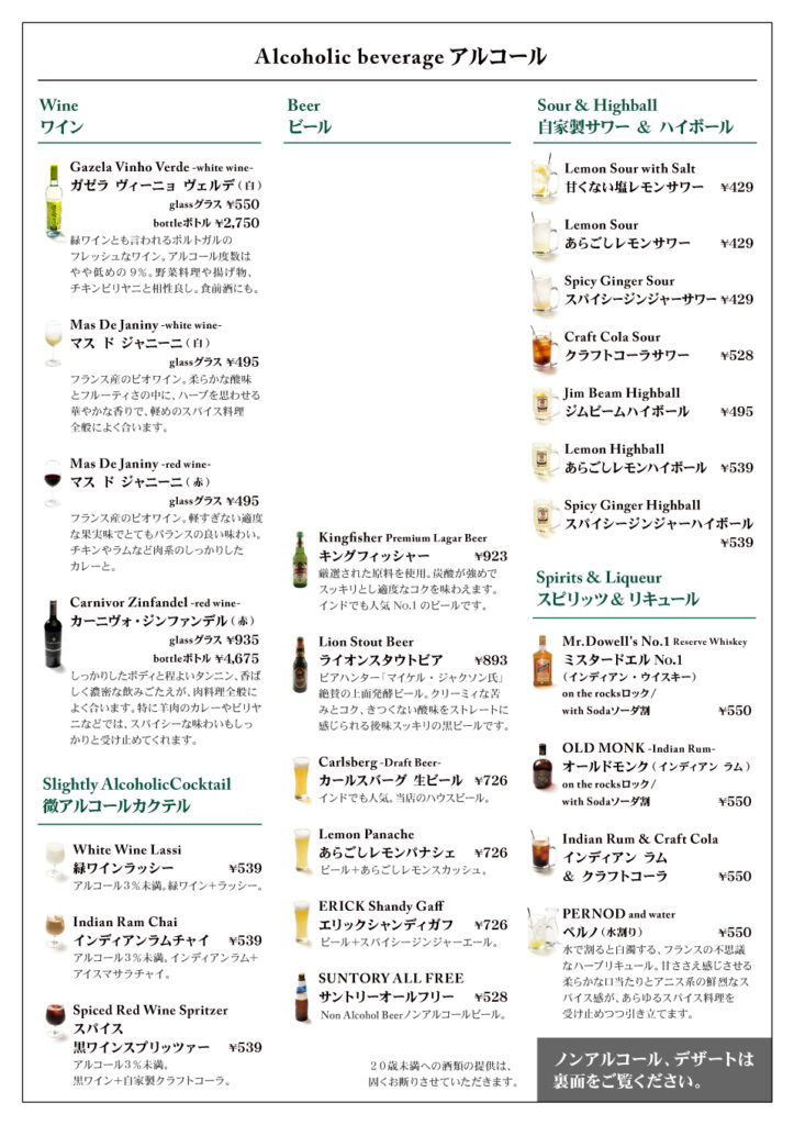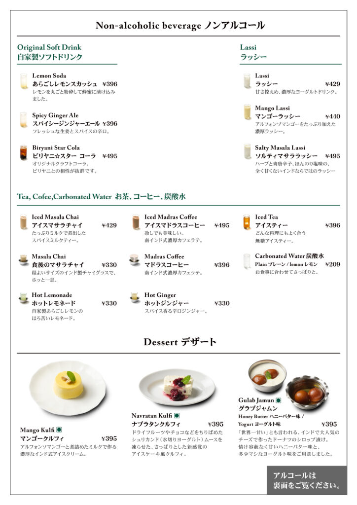 南インド料理初心者向けのお手軽コースから、マニアも満足のスパイシーコースまで、さまざまなコースをご用意しております。 オリジナルカクテルや各種ラッシーなど飲み放題メニューも充実。 他にも当日オーダーもできる二人用ディナーもご用意しております。
