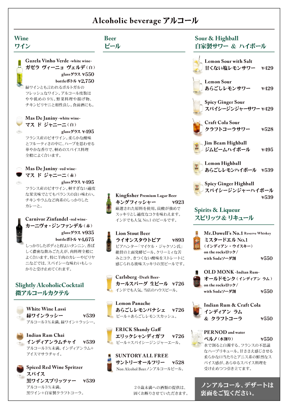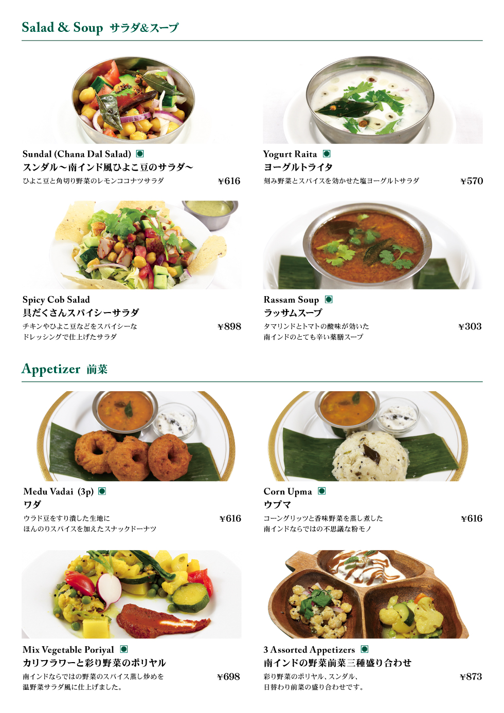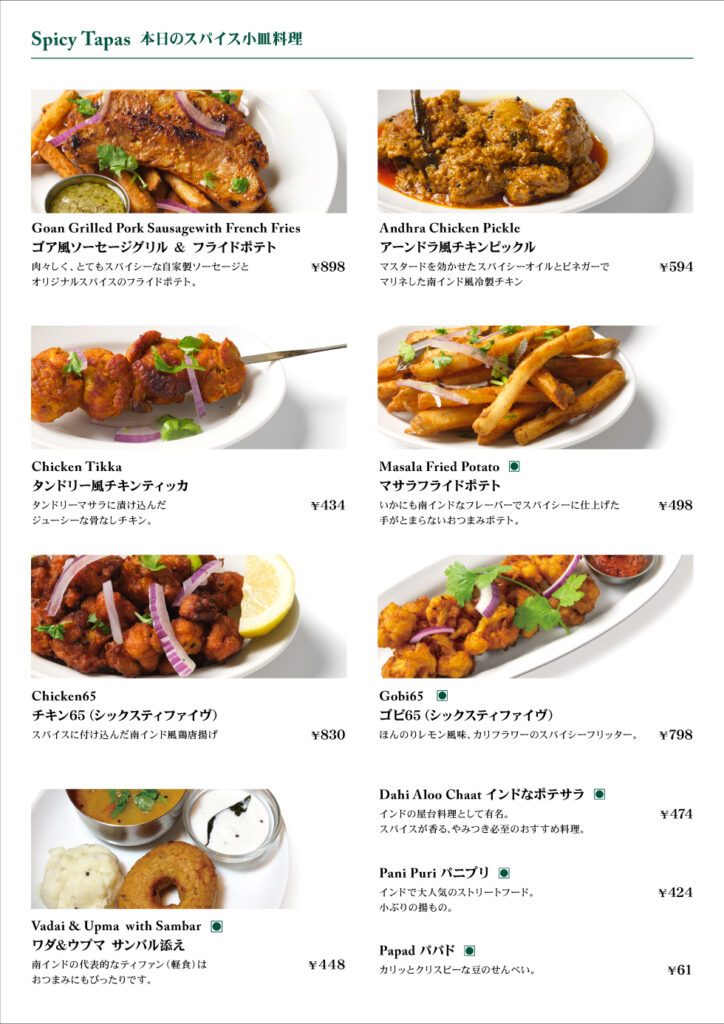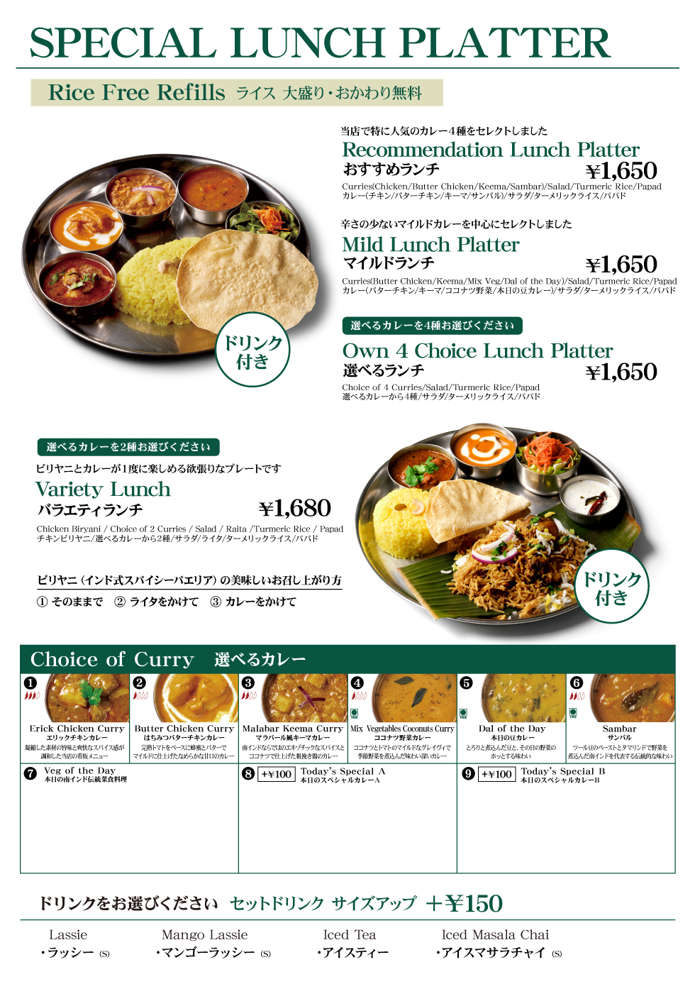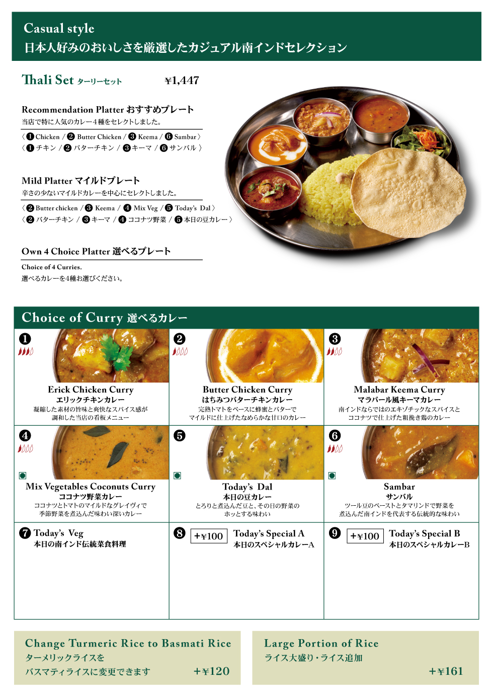 南インド料理初心者向けのお手軽コースから、マニアも満足のスパイシーコースまで、さまざまなコースをご用意しております。 オリジナルカクテルや各種ラッシーなど飲み放題メニューも充実。 他にも当日オーダーもできる二人用ディナーもご用意しております。