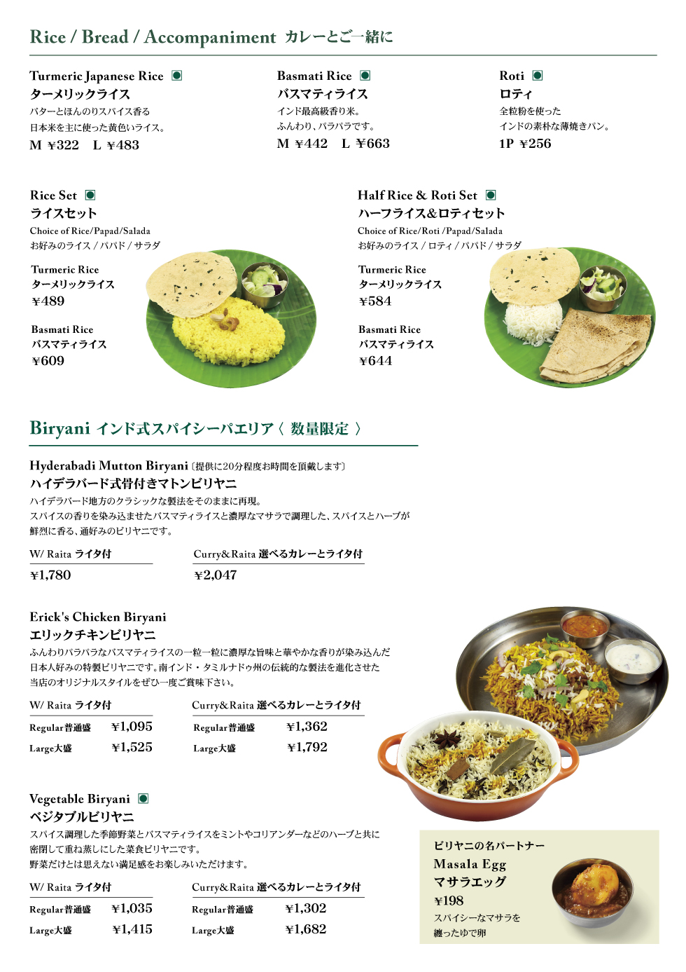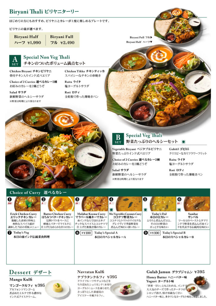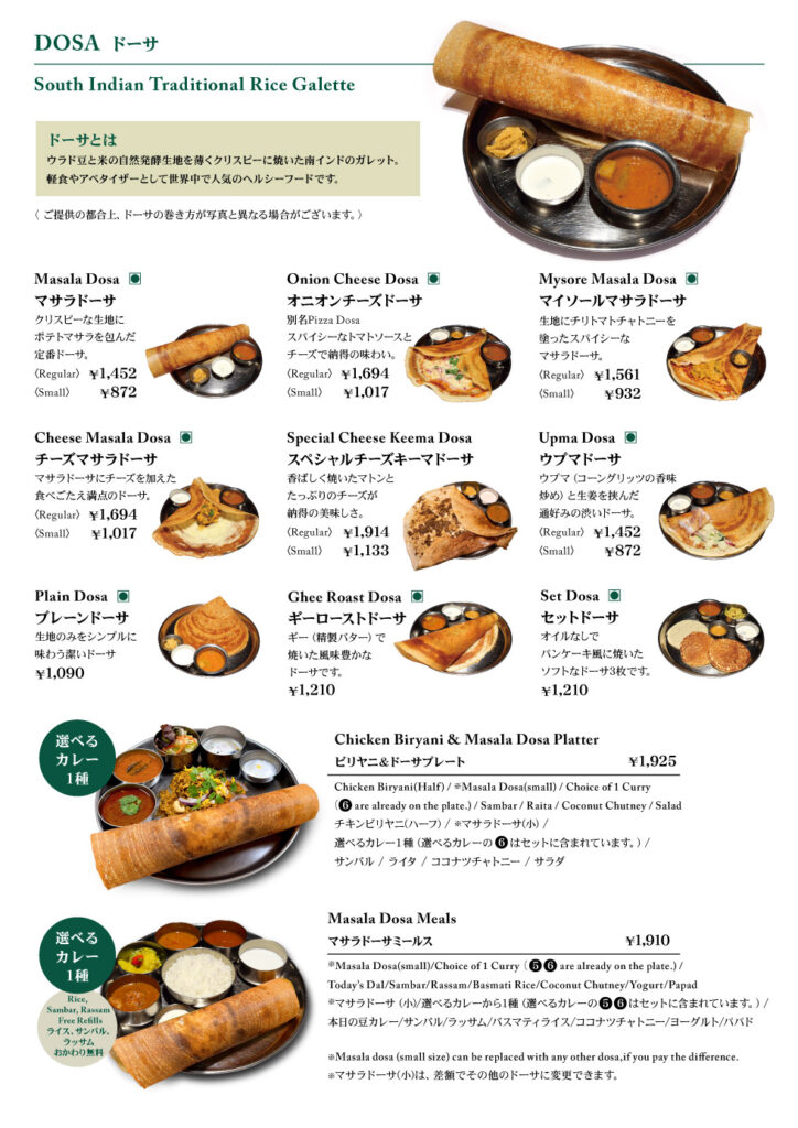 南インドらしいサラっとスパイシーなエリックチキンカレー、濃厚なバターチキンカレー、お肉を使わない菜食カレー、個性豊かなカレーたち、インド式スパイシーパエリア「ビリヤニ」、南インド式スパイス定食「ミールス」、南インドのガレット「ドーサ」、現地の味わいにとことんこだわった料理の数々。南インド料理初心者からマニアの方までさまざまなスタイルで食事をお楽しみいただけます。エリックサウスでドーサを食べられるのは東海地方ではここだけです!