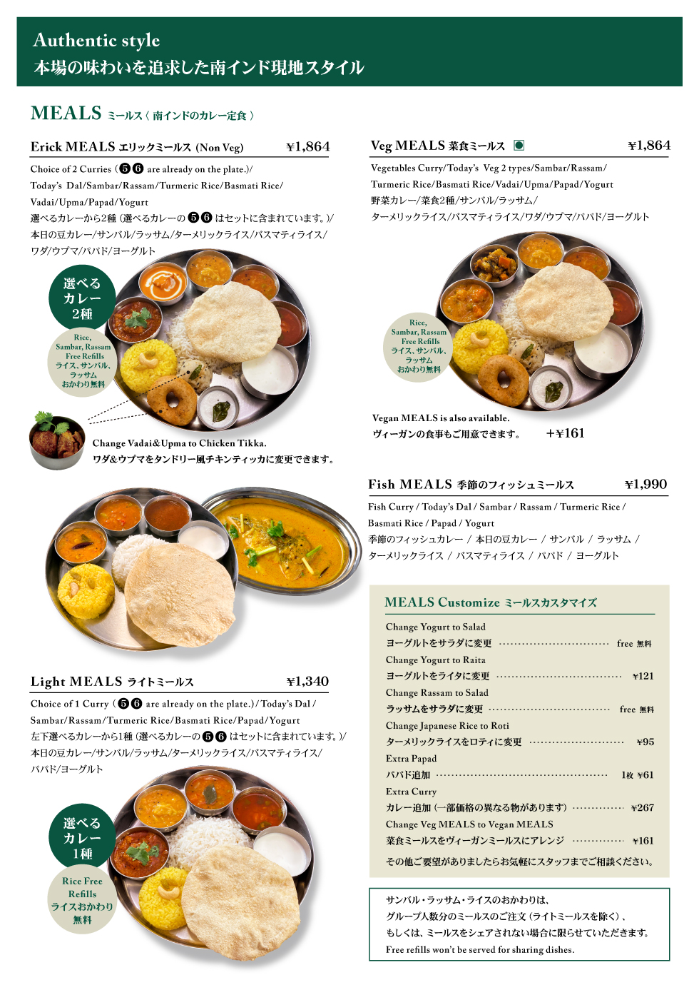 南インドの料理を象徴する食事のスタイル、ベジ(菜食)料理が中心のスパイス定食「ミールス」では、好みのカレーをプラスして自分好みのプレートをカスタマイズするのが当店のスタイル。全粒粉の薄焼きパン「ロティ」や「ドーサ」、「ワダ」などのティファン(南インドの軽食)を付けて楽しんでいただくのも◎。