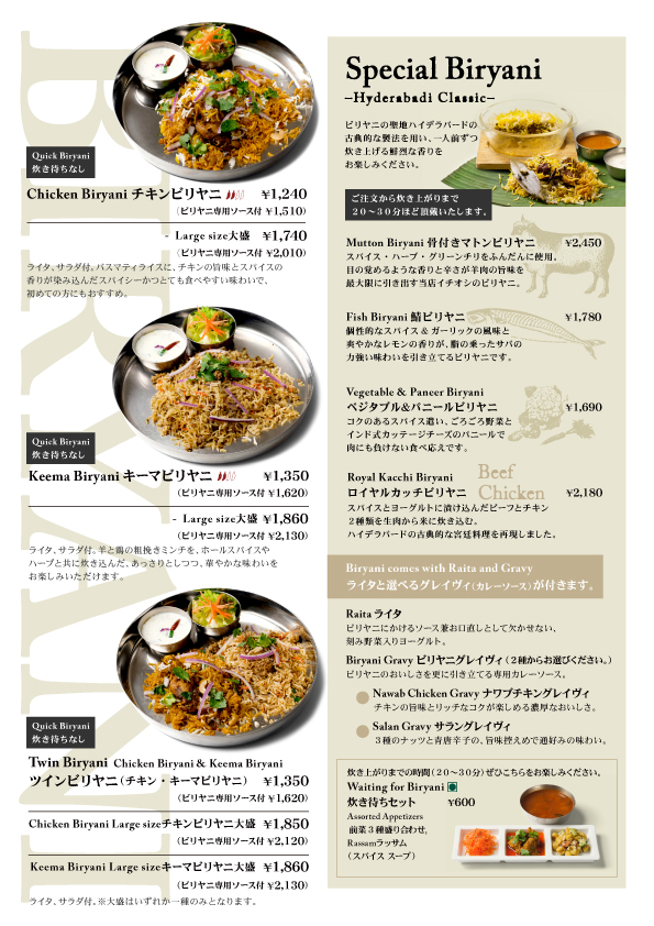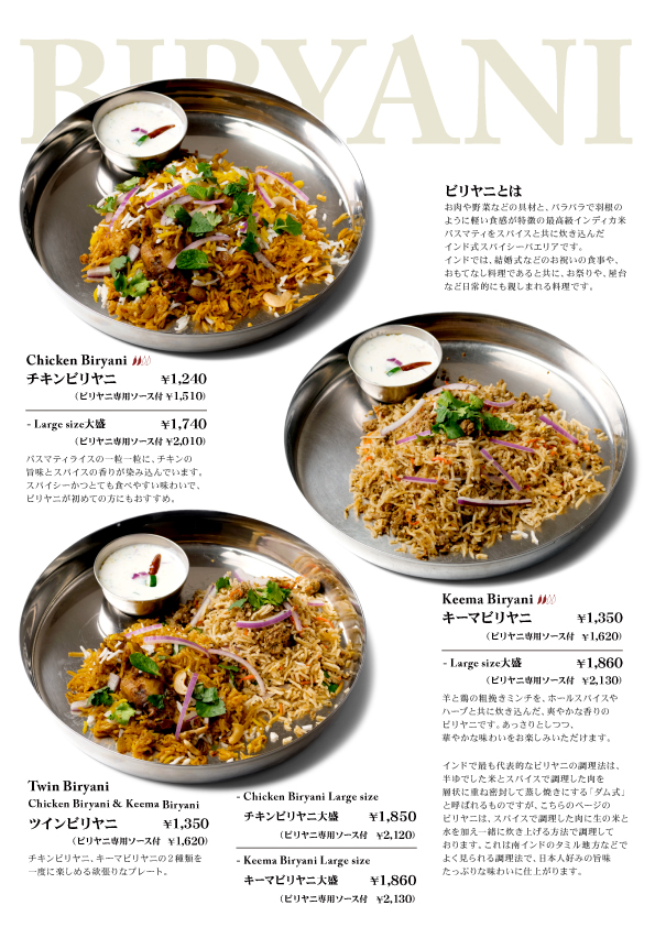 ビリヤニはインド式スパイシーパエリア。インドの代表的なおもてなし料理であり国民食です。南インドにおけるビリヤニの聖地とも言えるハイデラバードの古典的な製法によって都度炊き上げるスペシャルビリヤニを常時5種以上ご用意しております。