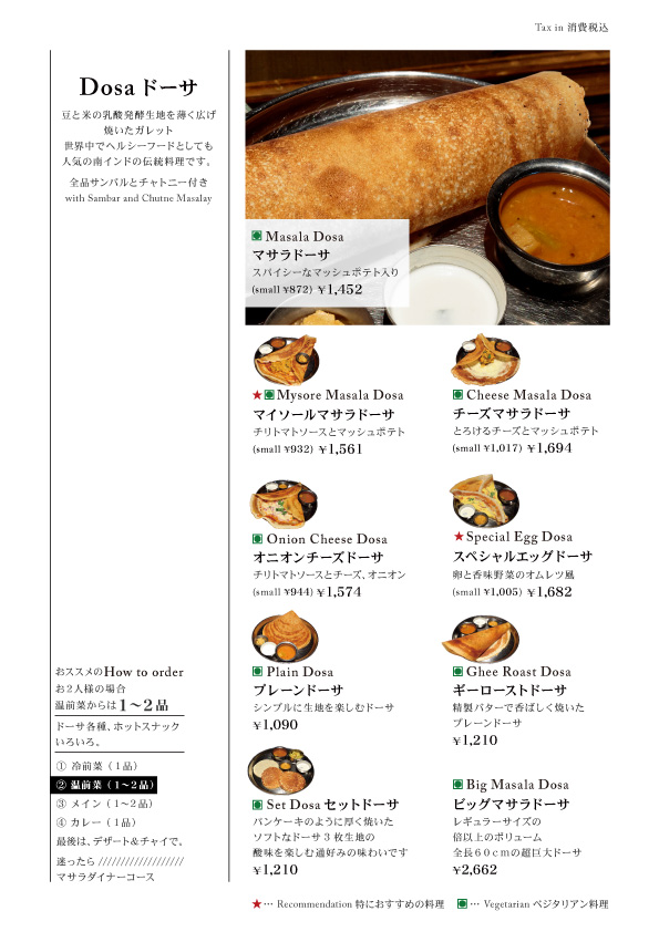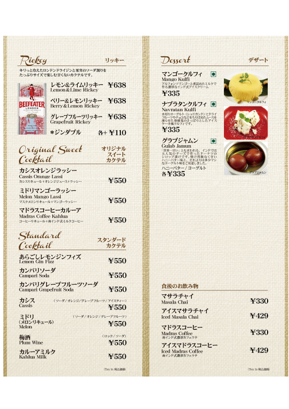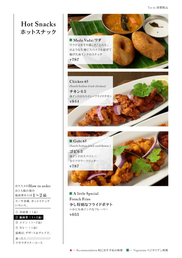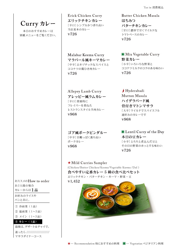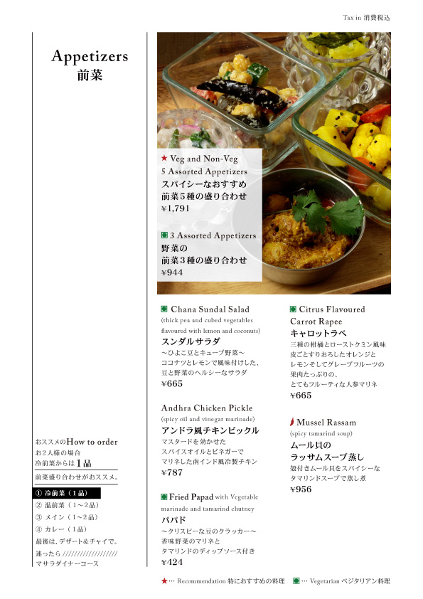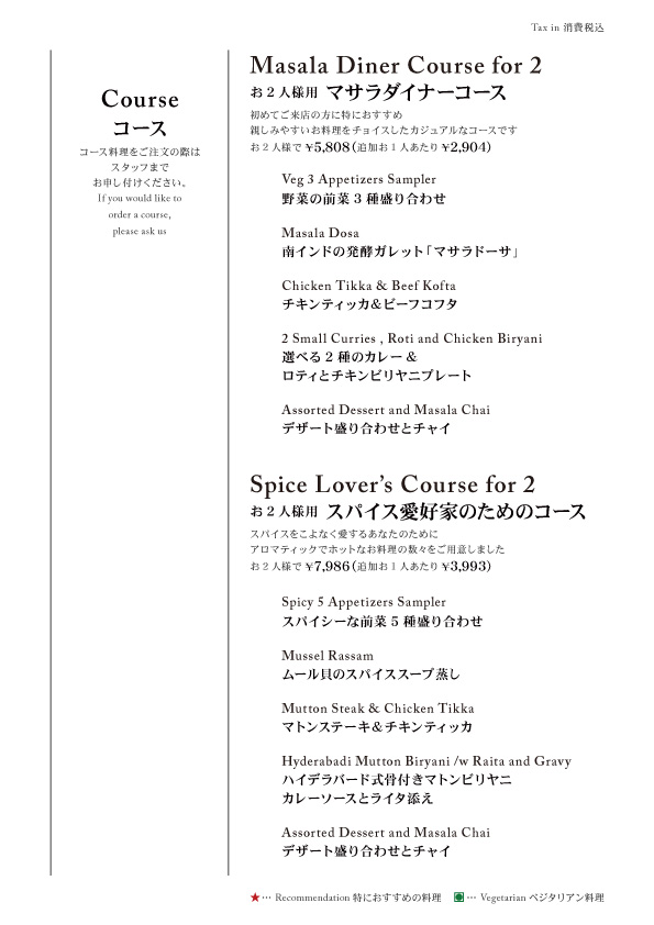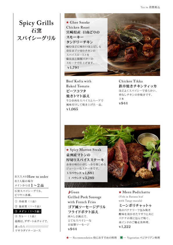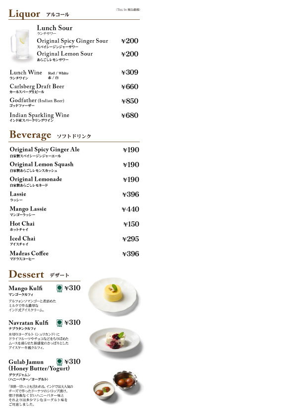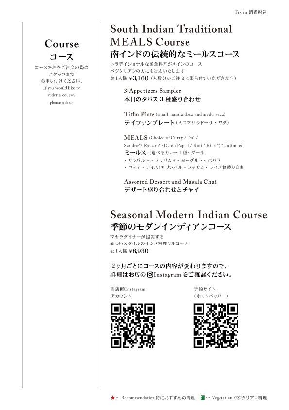 多彩なスパイス遣いの本格カレーはもちろんの事、野菜や豆を多用した南インドならではの伝統菜食料理からスパイスを駆使した石窯グリルまで、ここでしか味わえないオリジナリティを是非体験してみください。季節のモダンインディアンコースもオススメです。