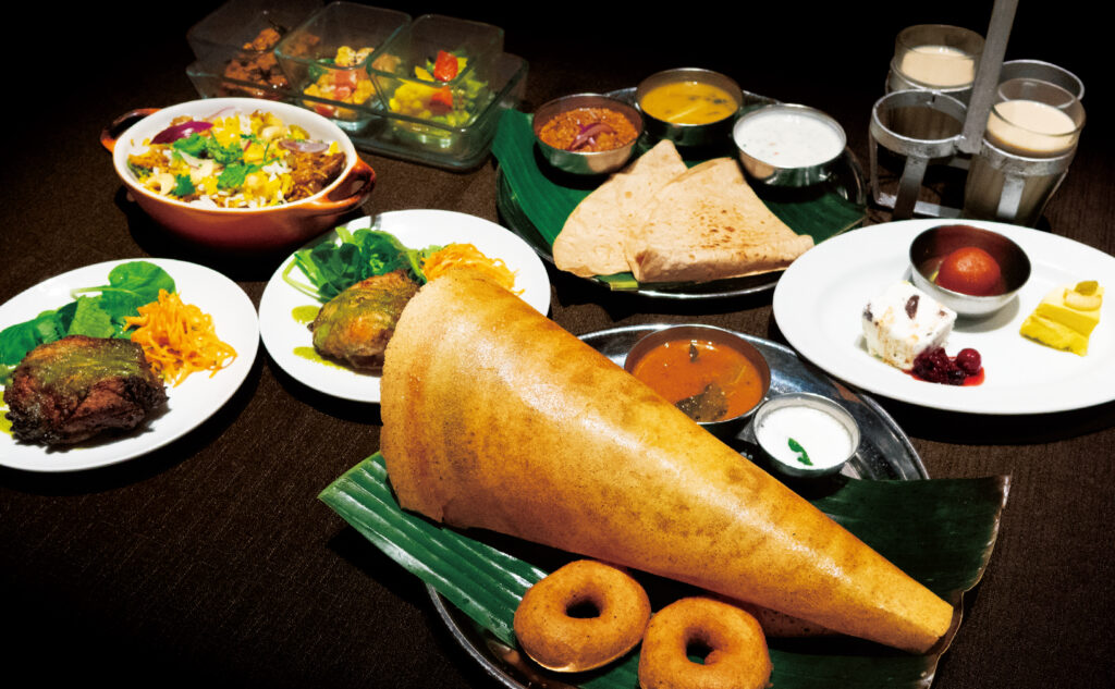 「ドーサ」は南インドのガレット。マッシュポテトを包んだドーサは、手でちぎってサンバルやチャトニに浸して食べるのがおすすめの食べ方です。休日は常時、平日の13時からはチーズマサラドーサやオニオンチーズドーサなどのバラエティーに富んだドーサもお楽しみいただけます。エリックサウスでドーサが食べられるのは全国で3店舗、西天満店がそのひとつです。