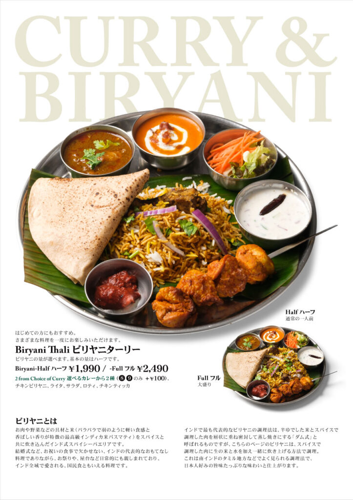 「ビリヤニ」はインド式スパイシーパエリア。インドの代表的なおもてなし料理であり国民食です。エリックサウス定番のチキンビリヤニはもちろん、ハイデラバードの古典的な製法を用いて都度炊き上げるマトン、サバなどのさまざまなスペシャルビリヤニも常時ご用意しております。