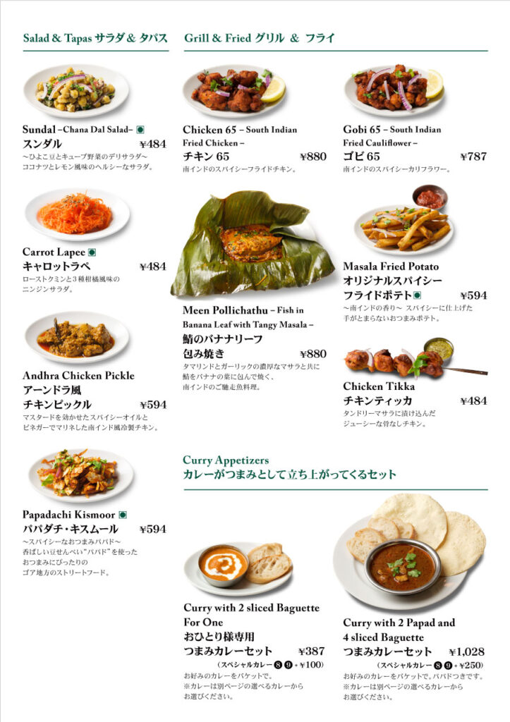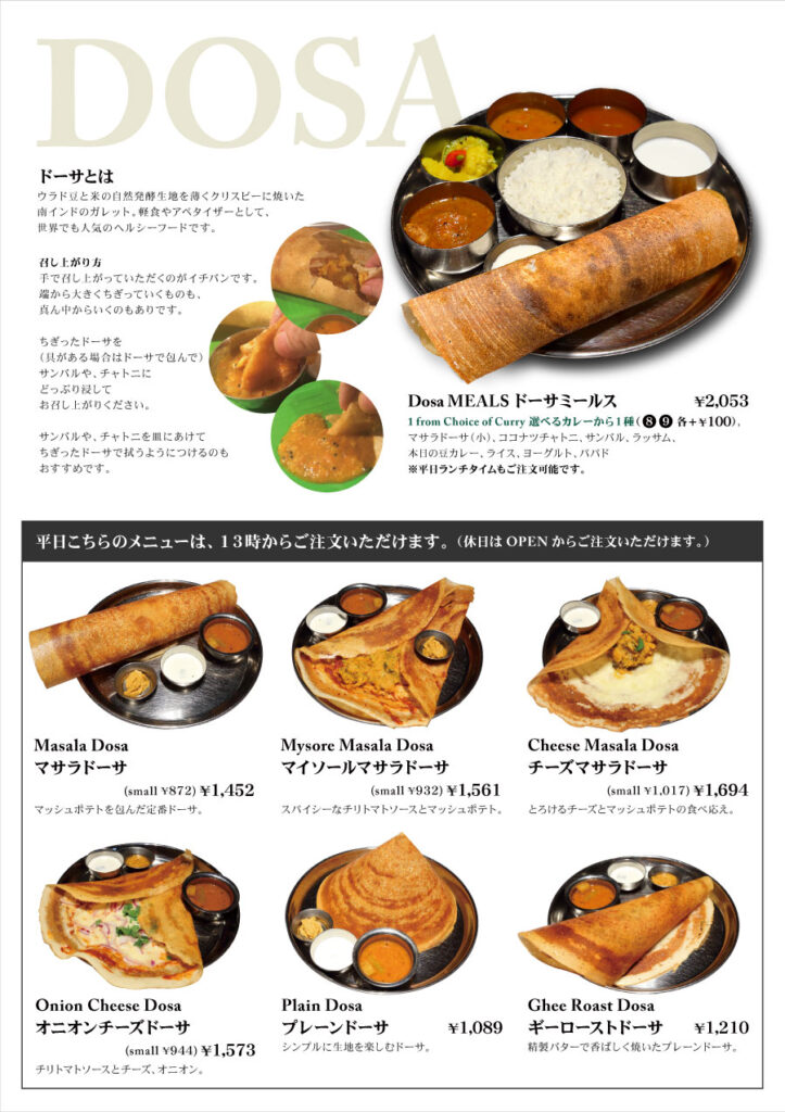 「ドーサ」は南インドのガレット。マッシュポテトを包んだドーサは、手でちぎってサンバルやチャトニに浸して食べるのがおすすめの食べ方です。休日は常時、平日の13時からはチーズマサラドーサやオニオンチーズドーサなどのバラエティーに富んだドーサもお楽しみいただけます。エリックサウスでドーサが食べられるのは全国で3店舗、西天満店がそのひとつです。