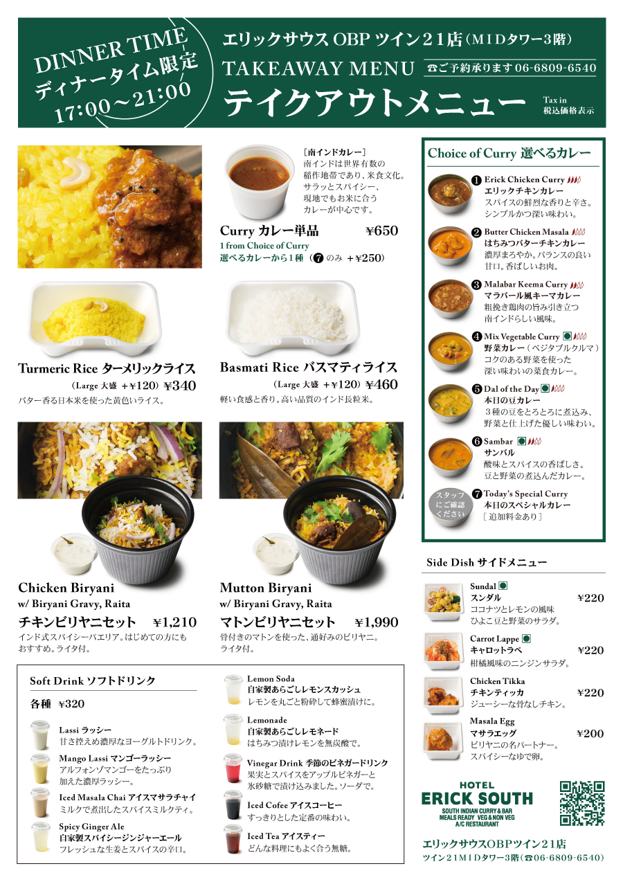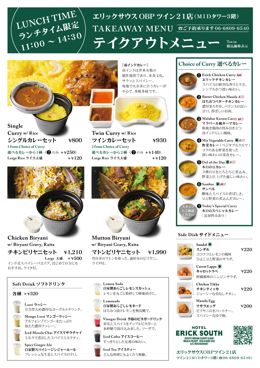 ツイン21 / ランチ / ディナー / テイクアウト / カレー / インド料理 / インドカレー / 南インド料理 / 南インドカレー / ミールス / ビリヤニ / 京橋駅徒歩5分 / 大阪ビジネスパーク駅 / 京橋駅周辺 / 大阪城周辺 / 円相 / えんそう /