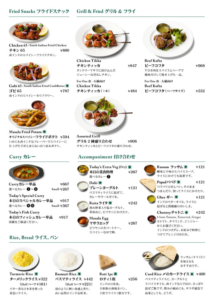 南インドらしいサラっとスパイシーな看板メニュー、エリックチキンカレーをはじめ、お肉を使わない菜食カレーサンバルなど、南インドらしいカレーを中心にラインナップ。カレープレートなどのメニューでお楽しみいただけます。