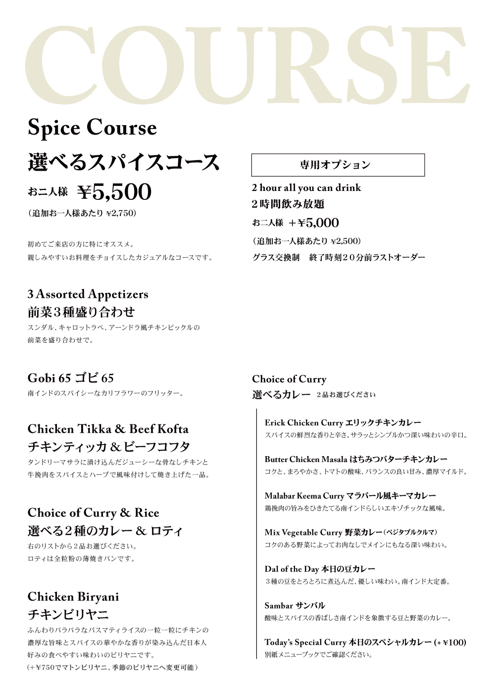 南インドの伝統料理に最新のモダンインディアンキュイジーヌのエッセンスを加えた、多彩な「スパイシータパス」や、素材の旨味をスパイスが引き立てるグリル料理などを取り揃え、普段使いのバルとしてもご利用いただけます。