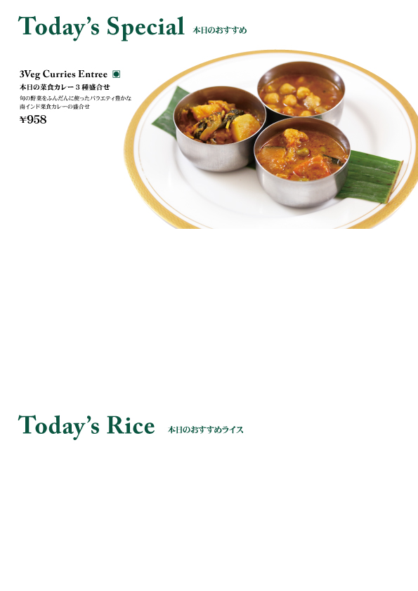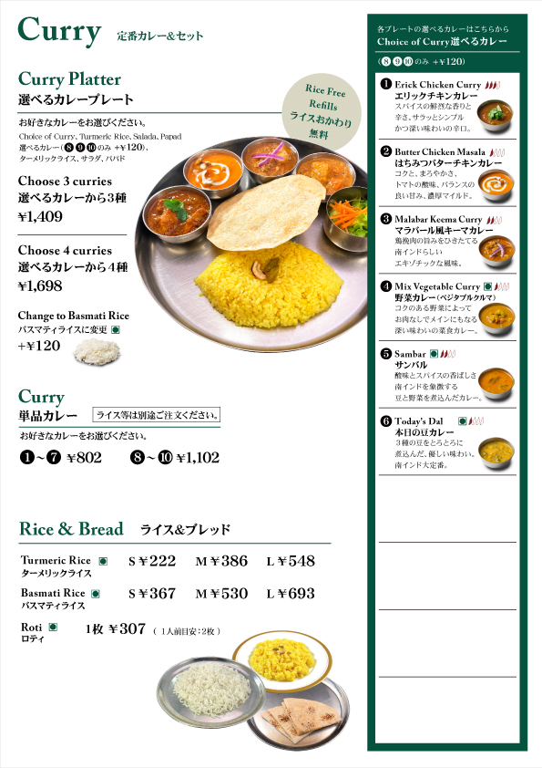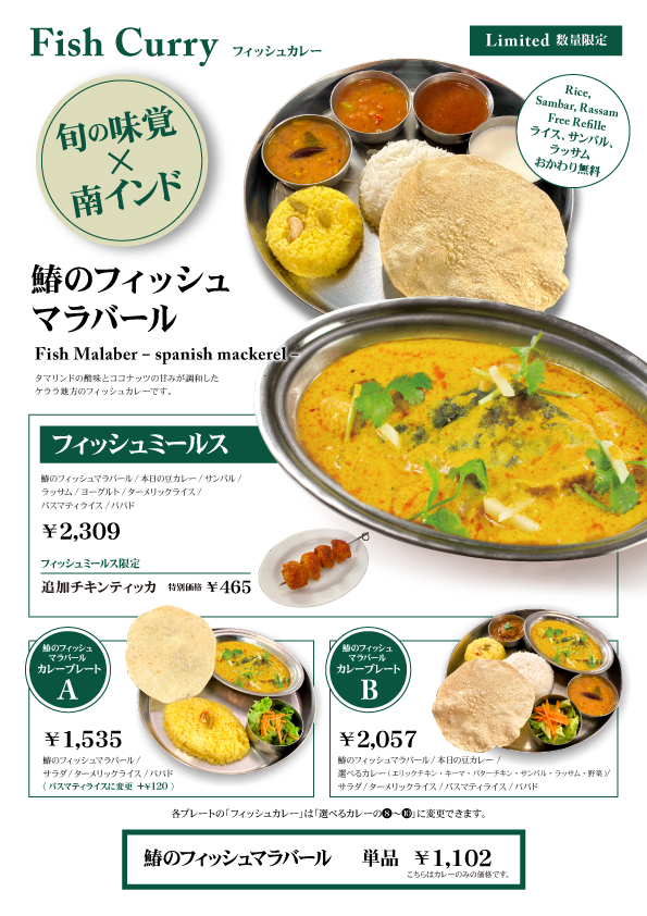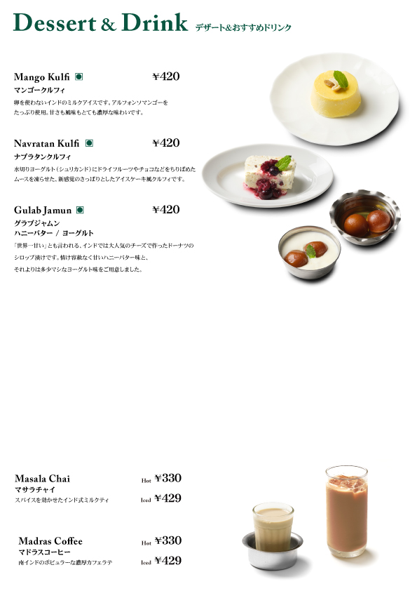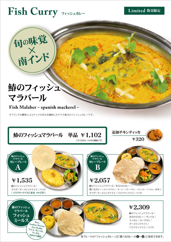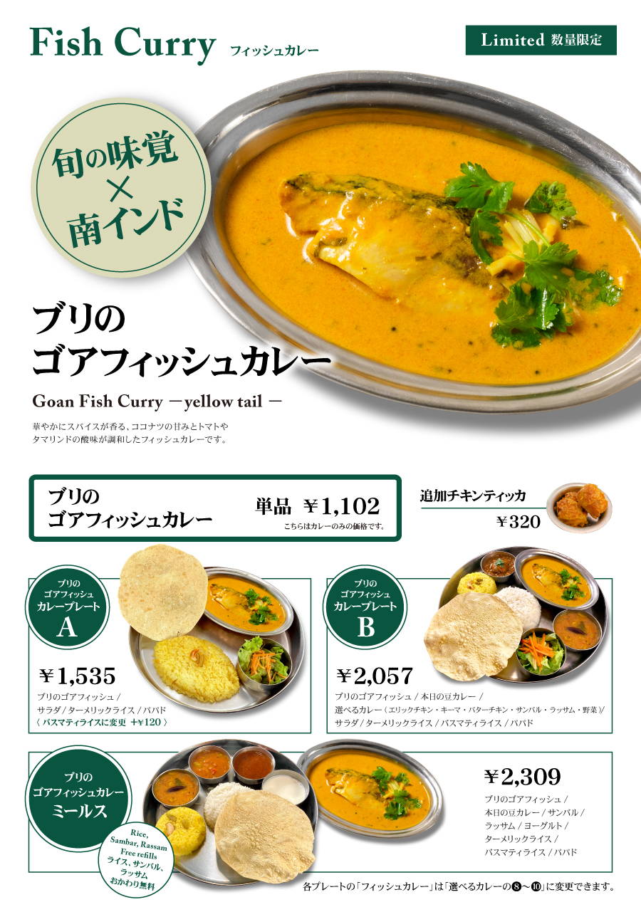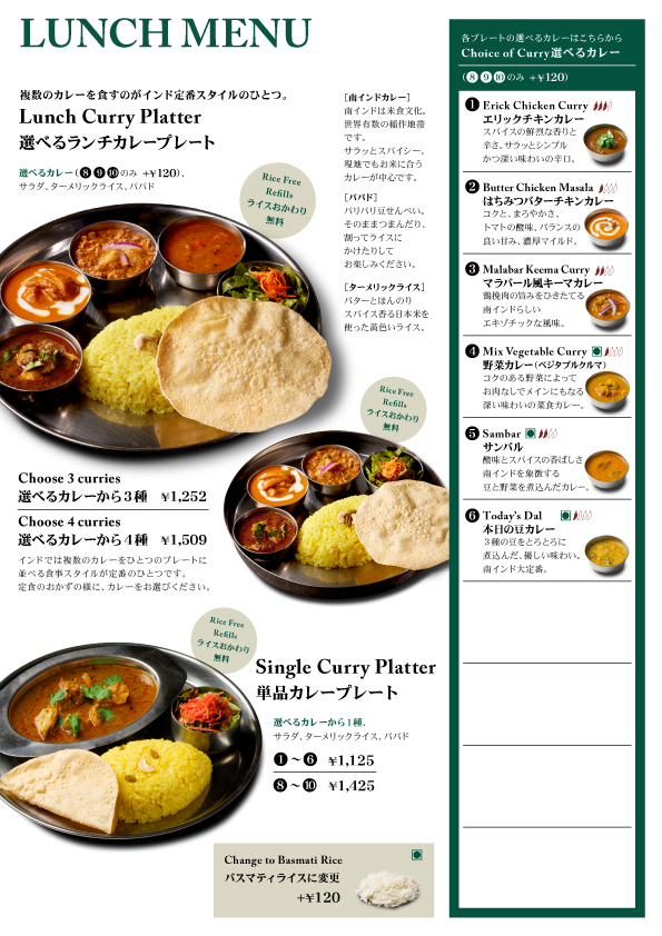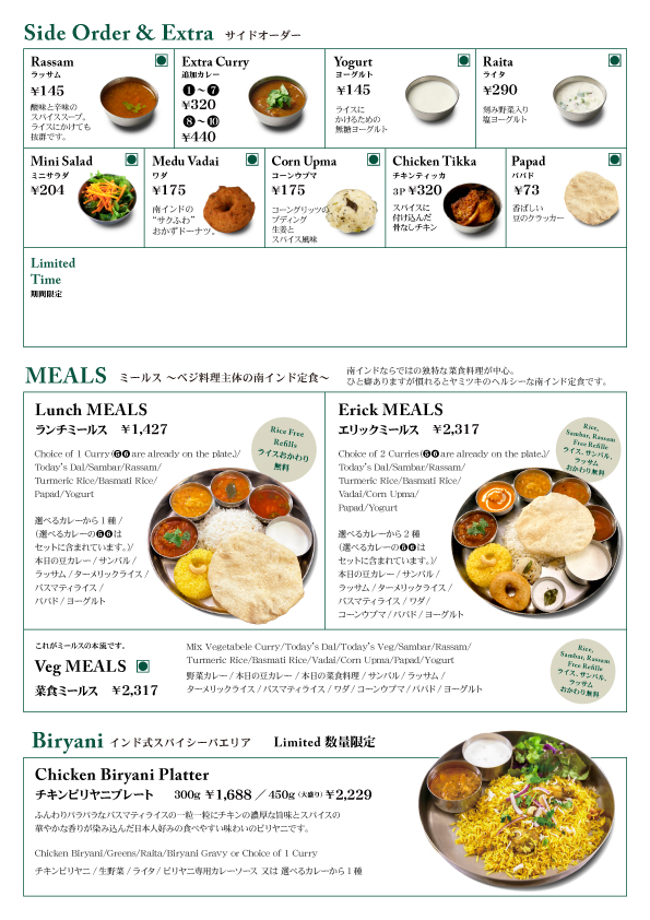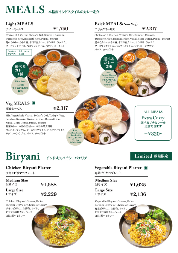 ミールス、ビリヤニ、ティファン、フィッシュカレーなどなど。エリックサウスの中では、小さなお店ではありますが、限定料理をはじめ、毎日でも飽きないメニューをご用意しております。